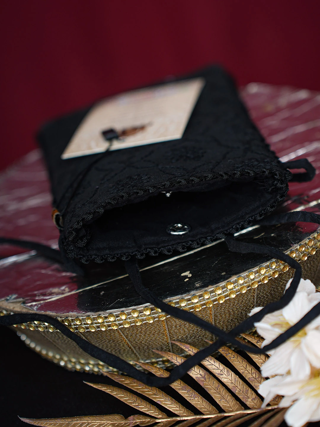 Silhouette: This soft Black Chanderi Fabric adds a graceful touch, while the hand-stitched floral or geometric patterns enhance its cultural charm. This mobile cover combines style and tradition, offering protection with a unique, handcrafted design. Perfect for those who appreciate fine craftsmanship and heritage-inspired accessories.