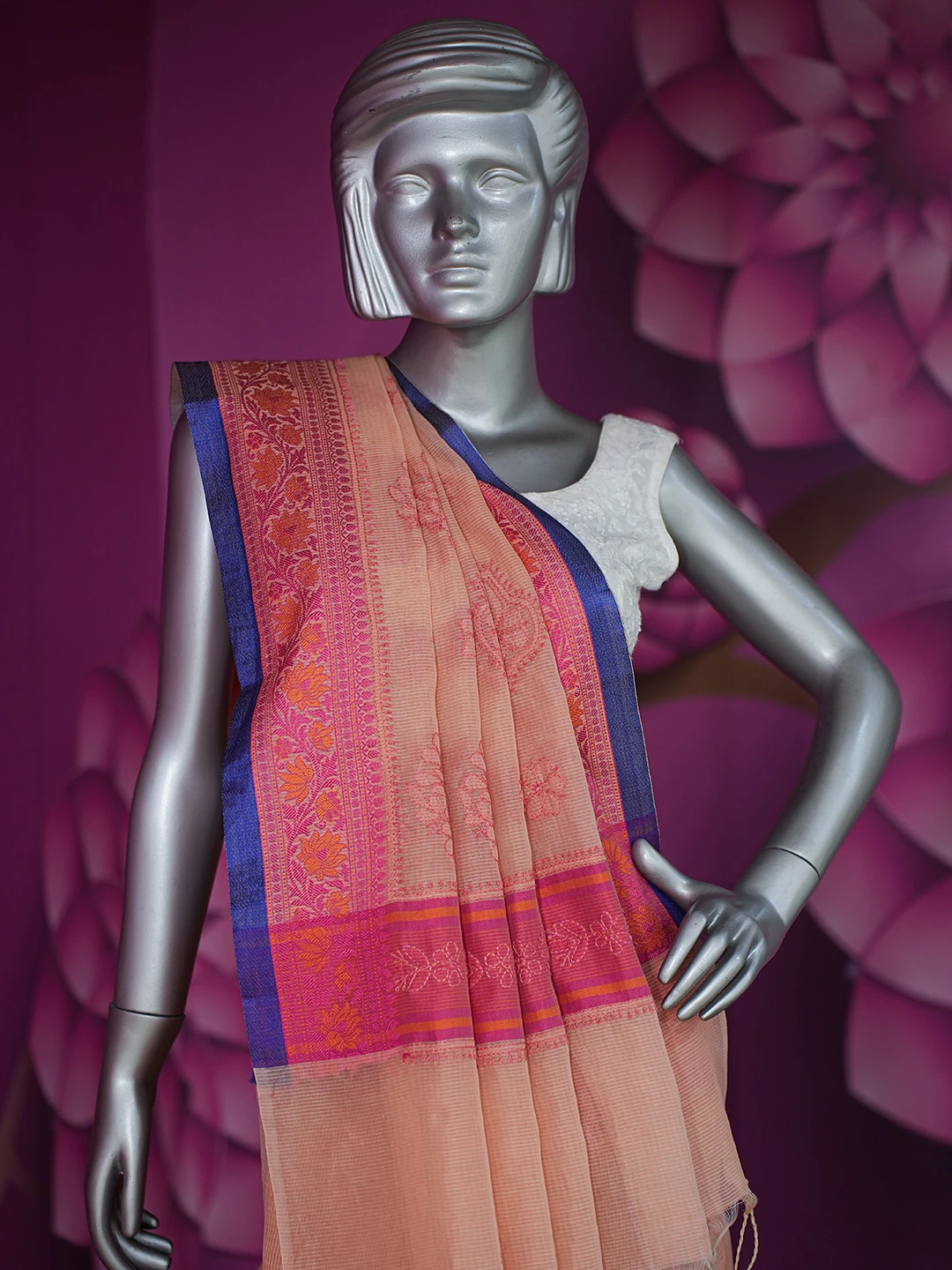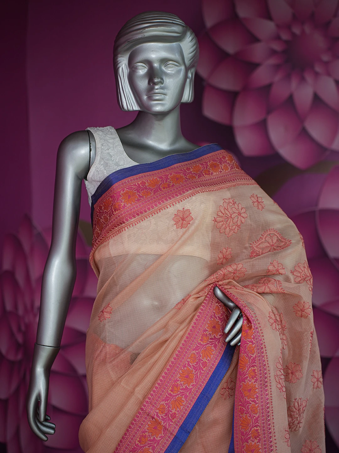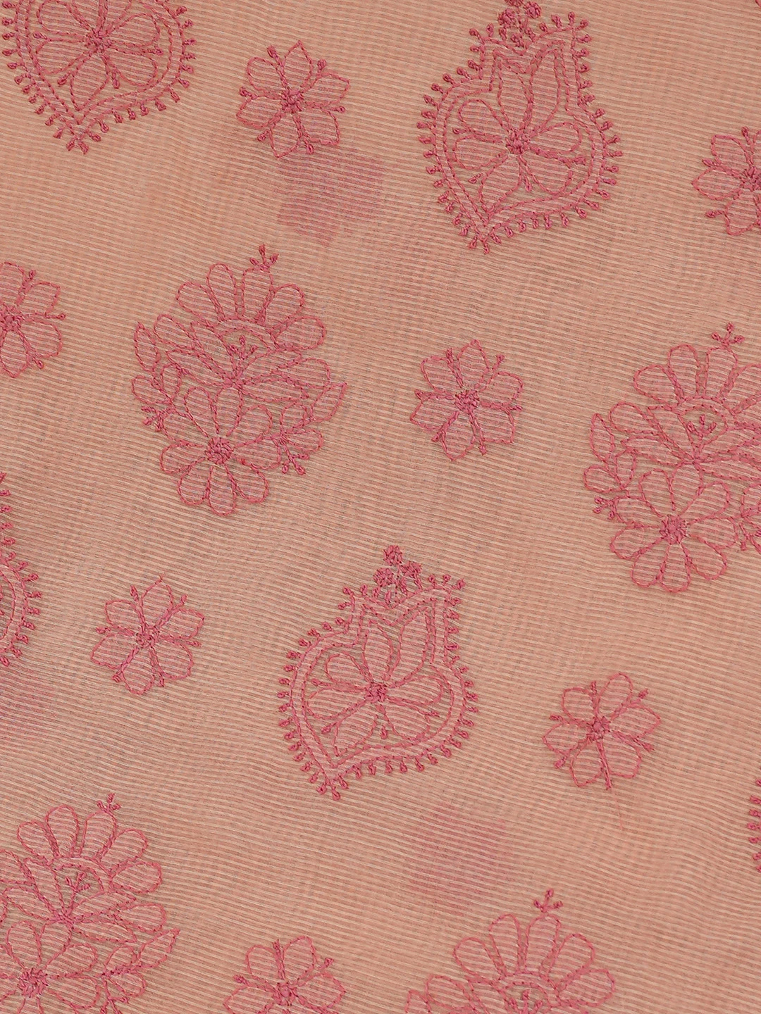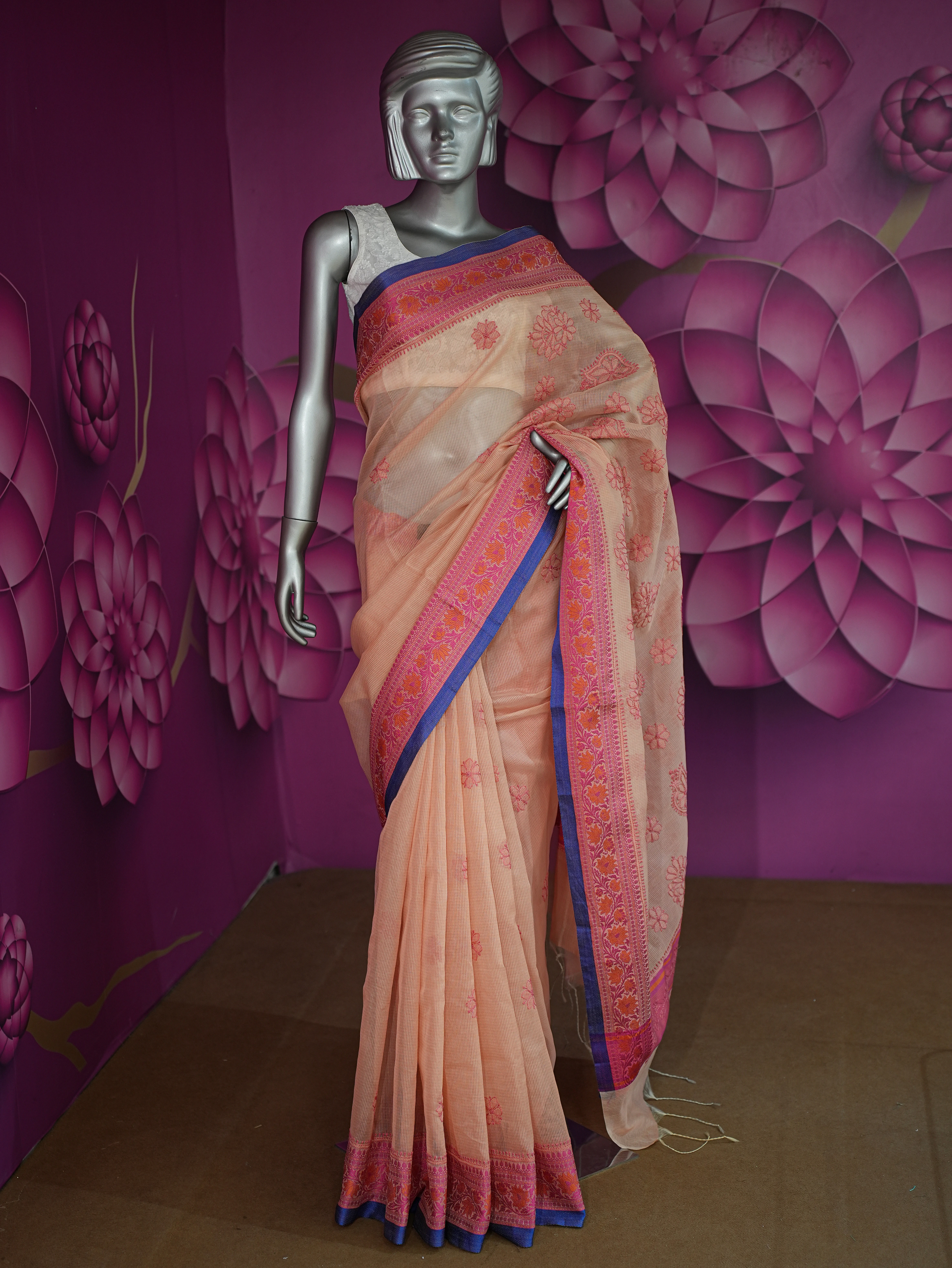 Silhouette: This Peach Chanderi Lucknowi Chikankari Saree, is meticulously crafted. The delicate hand-embroidered Chikankari work adorning the saree exudes finesse and grace, adding a touch of traditional charm to your ensemble. Crafted with care and precision, the soft and breathable chanderi fabric ensures comfort throughout the day, making it ideal for any occasion, whether a festive celebration or a formal event. The soothing Peach hue complements a wide range of skin tones, radiating a subtle yet captivating allure.